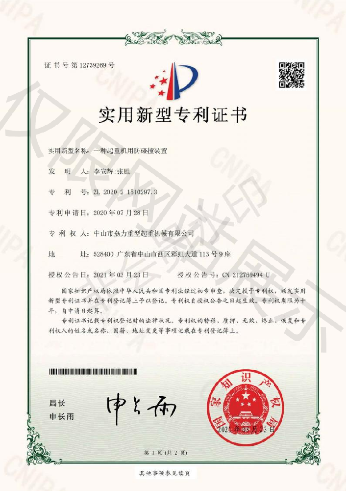 實用新型專利證書 -- 起重機用防撞裝置